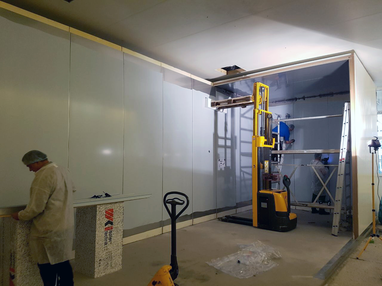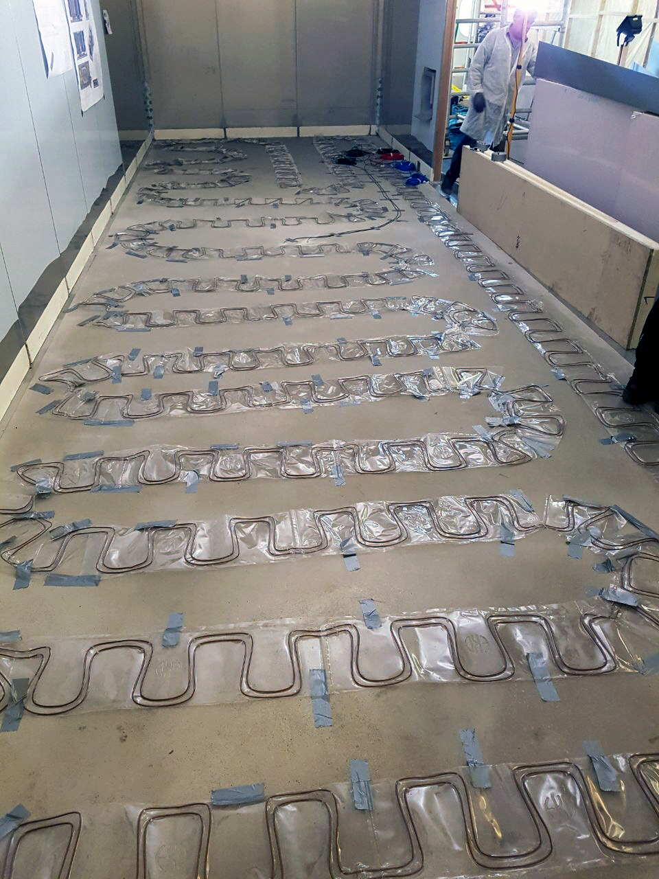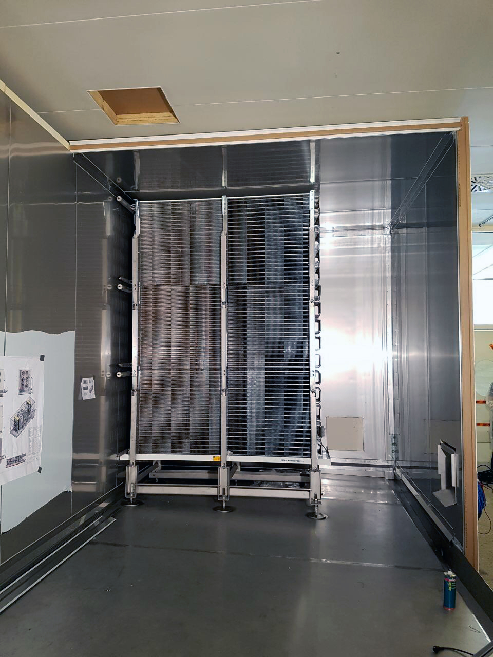 Der Bodenaufbau, der mit Unterfrierschutz versehen ist, wurde fertiggestellt sowie der erste Verdampfer aufgebaut. Der erkennbare Zellenaufbau des Systems steht für den hohen Grad an Individualisierbarkeit und die wartungsfreundliche Konzeption. Für den Kunden waren diese Kriterien der ausschlaggebende Faktor für ihre Investition in den WSM Doppelturm-Spiralfroster.