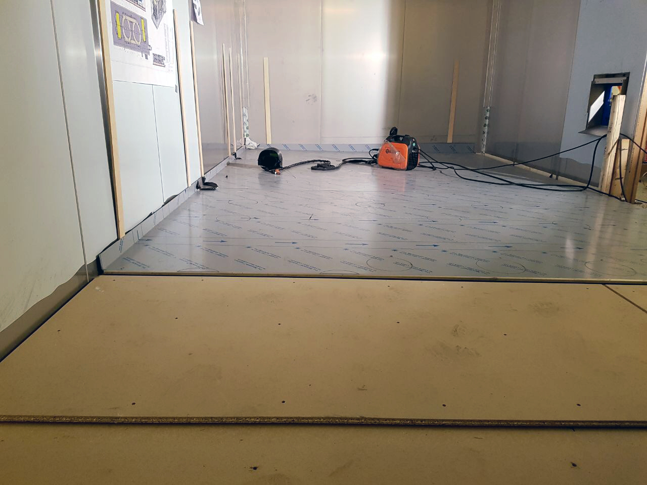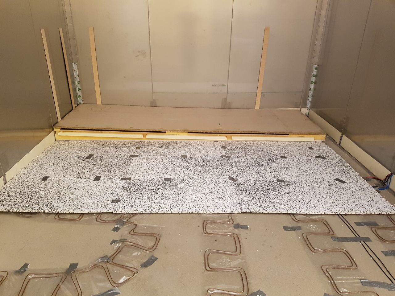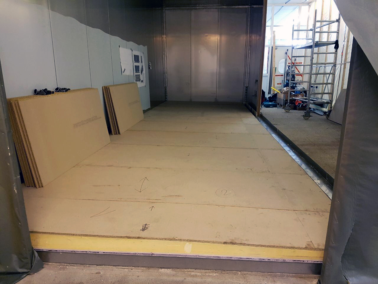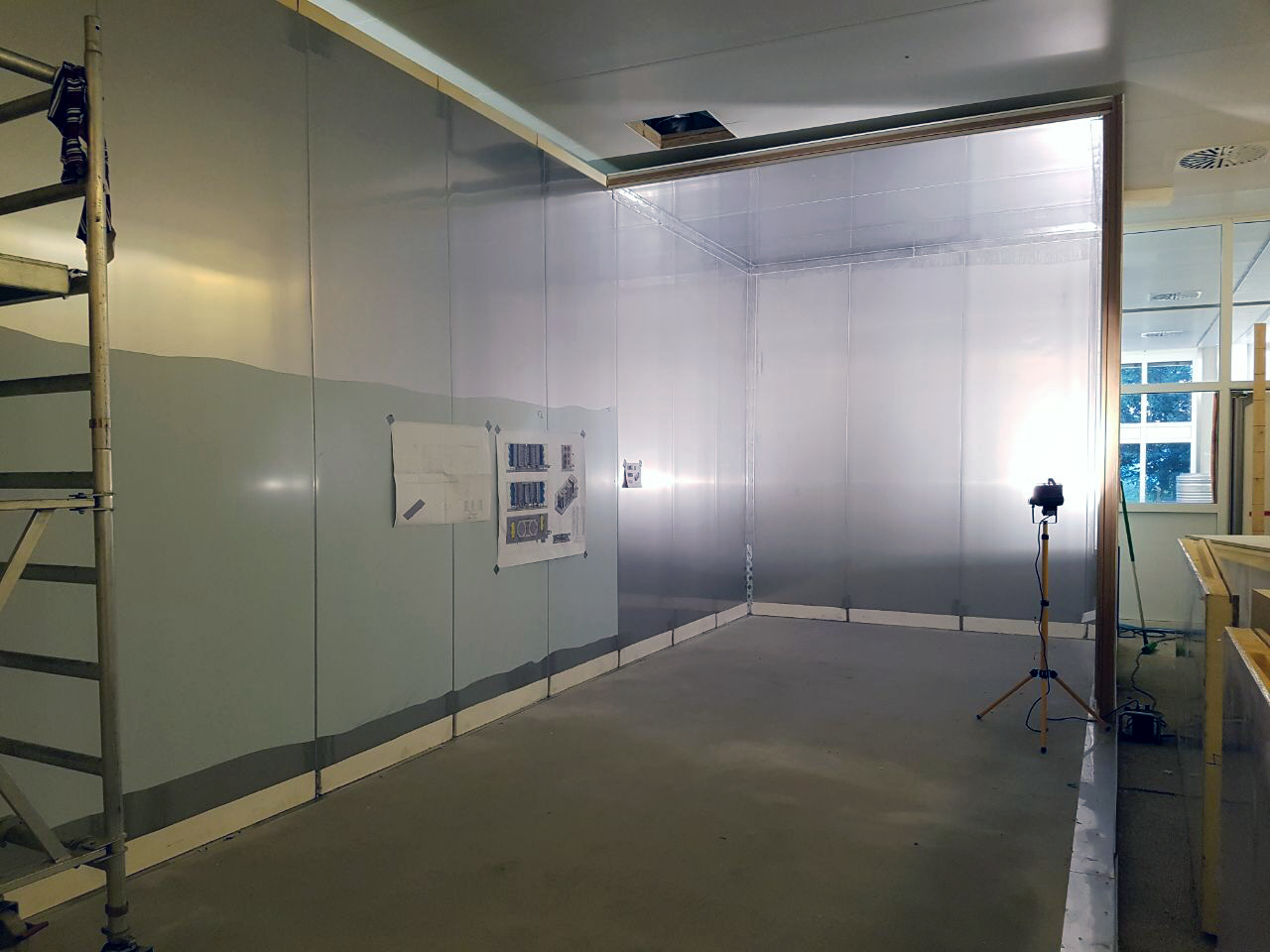Der Bodenaufbau, der mit Unterfrierschutz versehen ist, wurde fertiggestellt sowie der erste Verdampfer aufgebaut. Der erkennbare Zellenaufbau des Systems steht für den hohen Grad an Individualisierbarkeit und die wartungsfreundliche Konzeption. Für den Kunden waren diese Kriterien der ausschlaggebende Faktor für ihre Investition in den WSM Doppelturm-Spiralfroster.